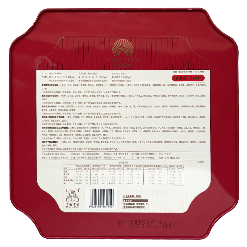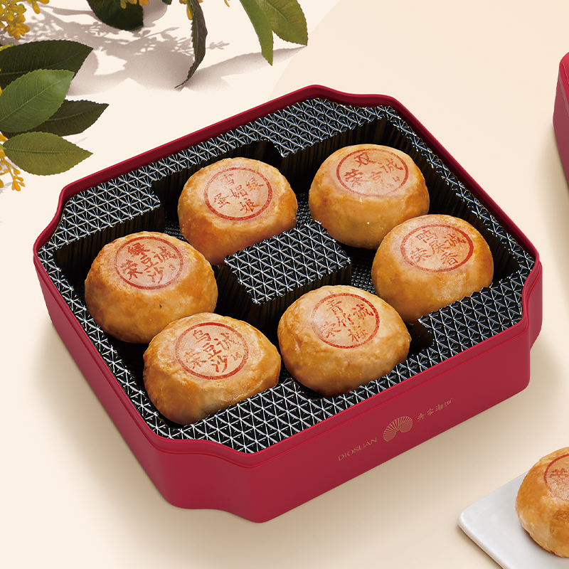 【編 碼】 YBT2317 【條形碼】 6925755561849 【尺 寸】 27.5x27.5x7.3cm 【凈含量】 560g 【規(guī) 格】 560gx10盒/箱 【內(nèi)容物】  100g潮式綠豆沙月餅x1+100g潮式烏豆沙月餅x1+100g潮式雙烹月餅x1+100g潮式單叢鴨屎香茶月餅x1+80g潮式雪媚娘蛋黃綠豆沙月餅x1+80g潮式青竹梅月餅x1