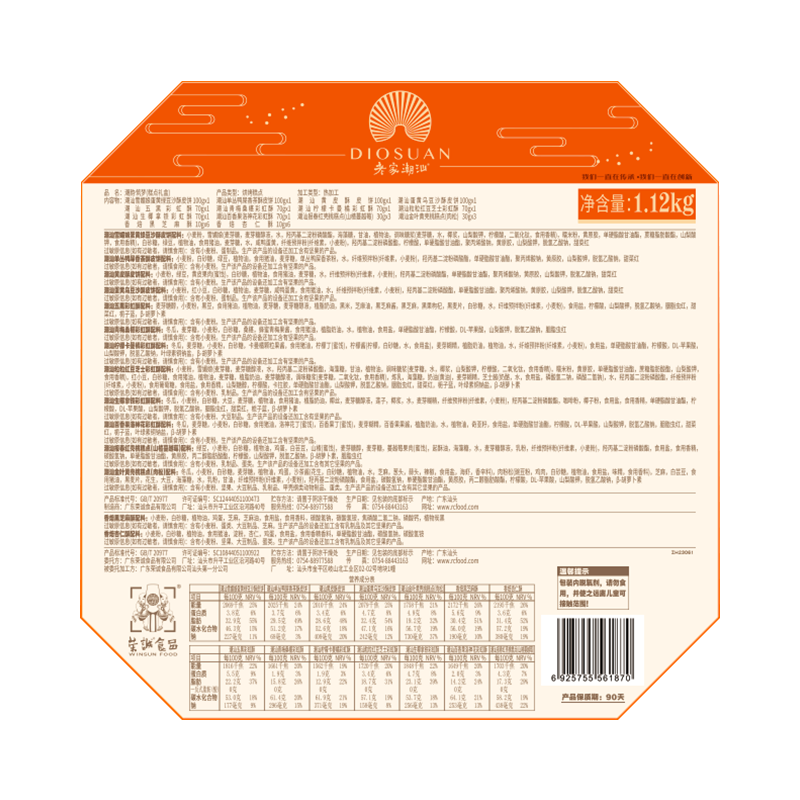 【編 碼】 YBZ2320 【條形碼】 6925755561870 【尺 寸】 25x25x21cm 【凈含量】 1120g 【規(guī) 格】 1120gx4盒/箱 【內(nèi)容物】 100g潮汕雪媚娘蛋黃綠豆沙酥皮餅x1+100g潮汕單叢鴨屎香茶酥皮餅x1+100g潮汕黃皮酥皮餅x1+100g潮汕蛋黃烏豆沙酥皮餅x1+70g潮汕五黑彩虹酥x1+70g潮汕青梅桑椹彩虹酥x1+70g潮汕檸檬卡曼橘彩虹酥x1+70g潮汕粒粒紅豆芝士彩虹酥x1+70g潮汕生椰拿鐵彩虹酥x1+70g潮汕百香果洛神花彩虹酥x1+30g潮汕報春紅殼桃糕點(山楂蔓越莓)x3+30g潮汕金葉黃殼桃糕點(肉松)x3+10g香焙黑芝麻酥x6+10g香焙杏仁酥x6